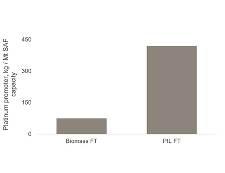 However, cobalt catalysts are preferred in PtL FT and these use platinum as a promoter. Even at very low concentrations, platinum improves cobalt catalyst reduction, stability, and dispersion, resulting in higher efficiency and longer lifetimes.