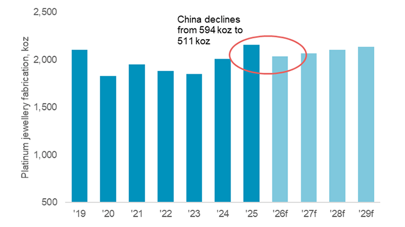 January 2026: Platinum Jewellery Demand Update. Today, platinum jewellery demand is globally diversified rather than being concentrated in China, as growth in markets outside of China between 2014 and 2024 partially compensated for a loss of demand in China over that period. In 2024, platinum jewellery demand returned to growth across all markets, including China, after troughing in the previous two years. Since the end of 2024, platinum jewellery demand has been benefiting from platinum’s price discount to gold. This was a key reason behind the estimated growth of 7% in global platinum jewellery demand seen in 2025, to reach a seven-year high.