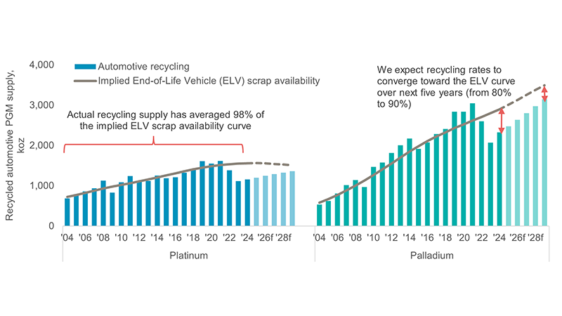 October 2025: Platinum Group Metals – Automotive Recycling Supply. WPIC research has identified that automotive PGM recycling supply is more price elastic than traditionally believed. This helps to explain why platinum recycling supply was depressed between 2022 and 2024, when the low PGM basket price led to some hoarding of spent autocatalysts by scrapyards that lacked the economic incentive to sell recovered catalysts. Higher PGM prices in 2025 are supportive of recycled supply growth. However, platinum automotive recycling supply is not expected to recover to the peak level reported in 2021, and we expect this to contribute to sustained platinum market deficits through 2029.