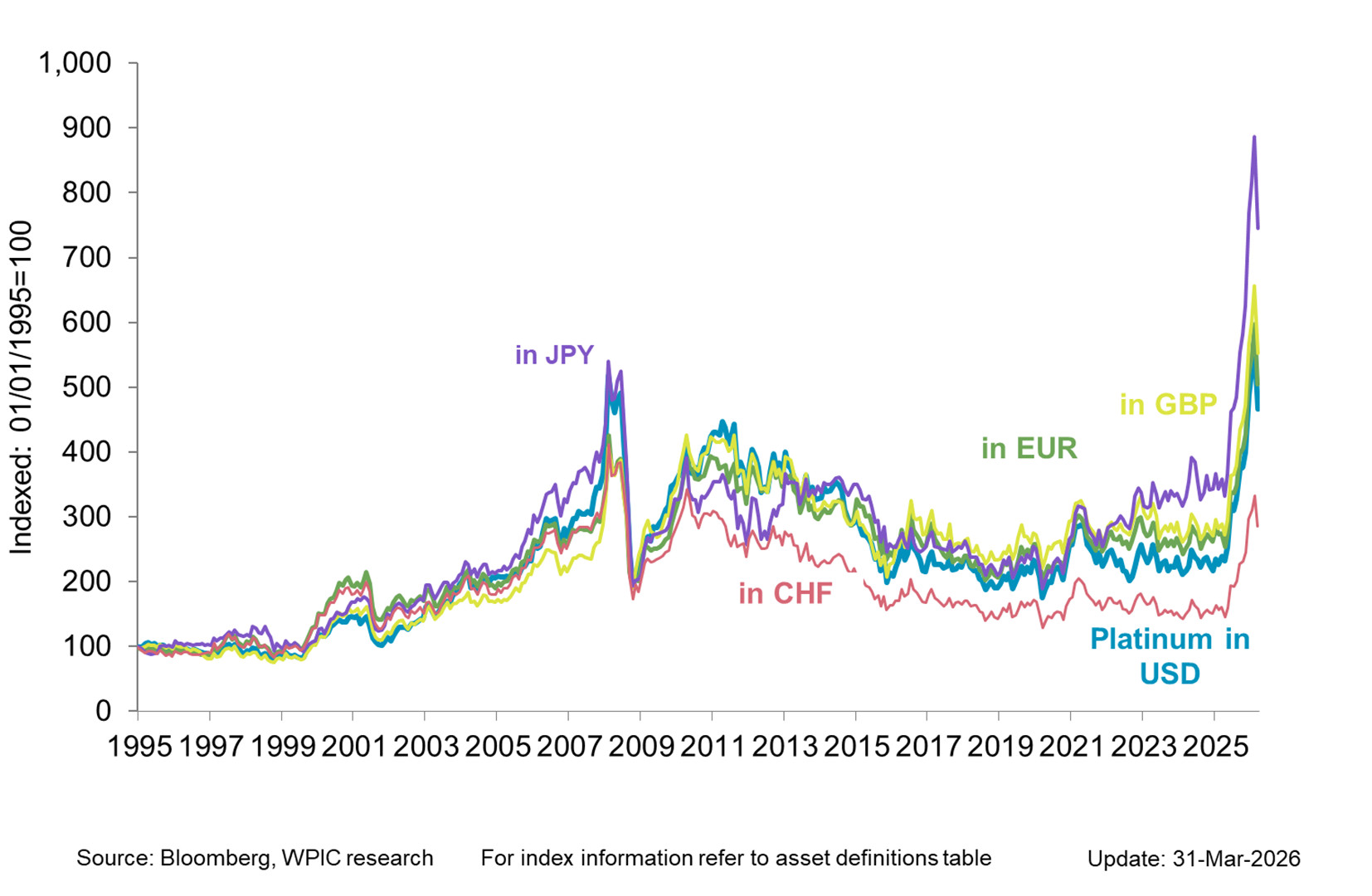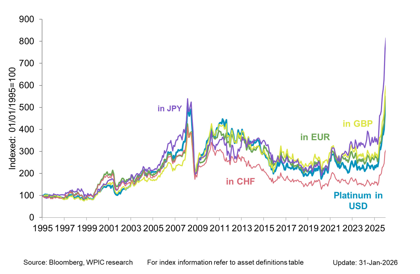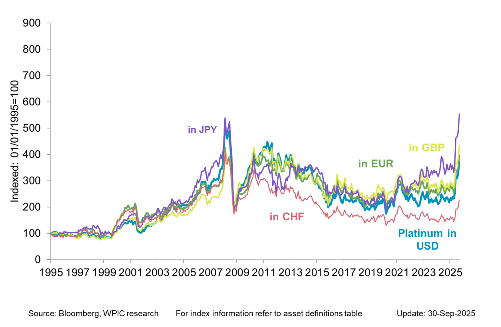 Platinum has outperformed in EUR, JPY and GBP