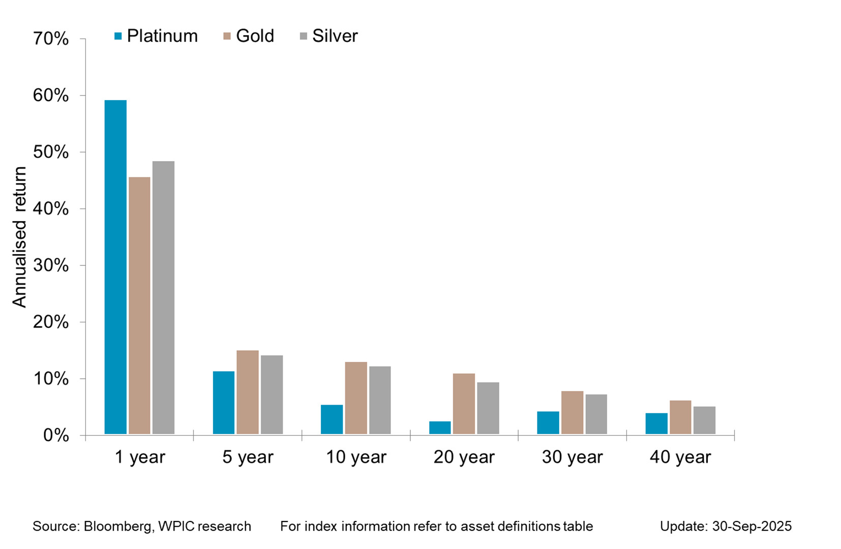 Precious metals price performance over 1, 5,10,20,30,40 year periods
