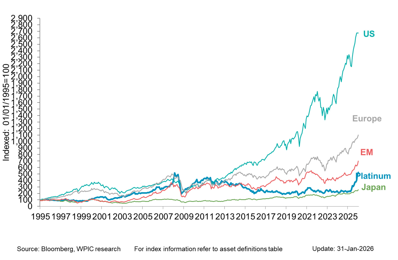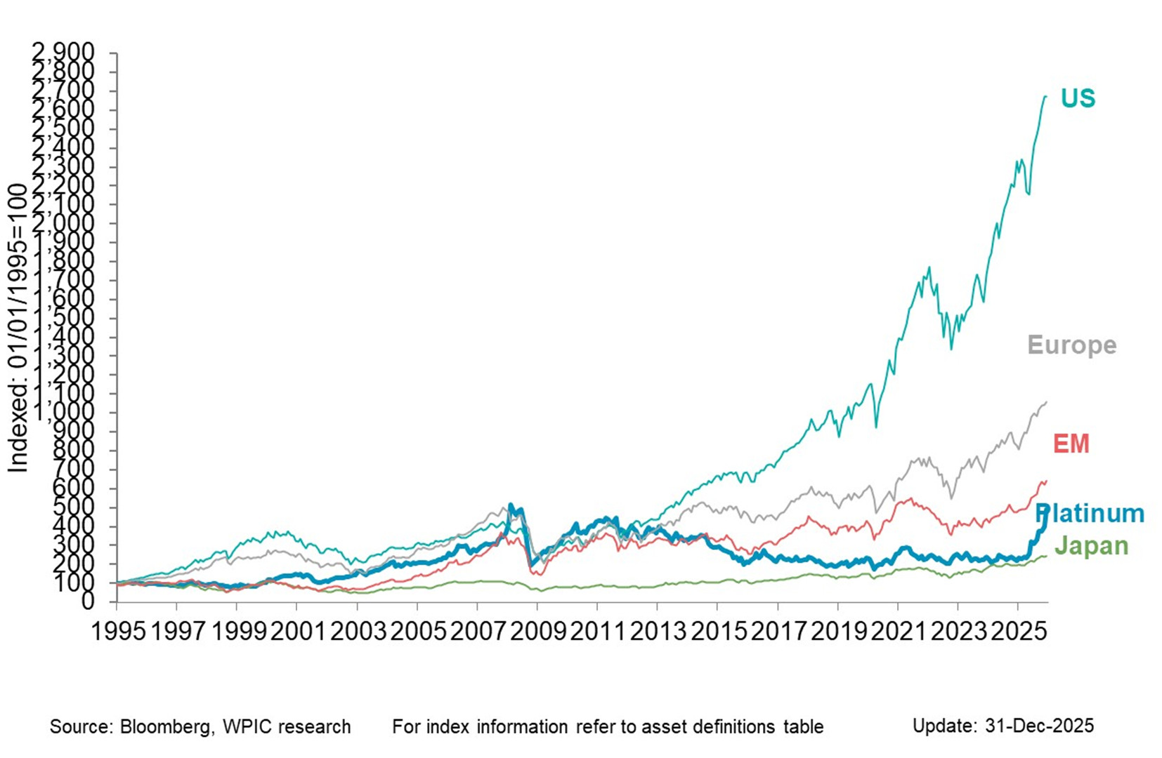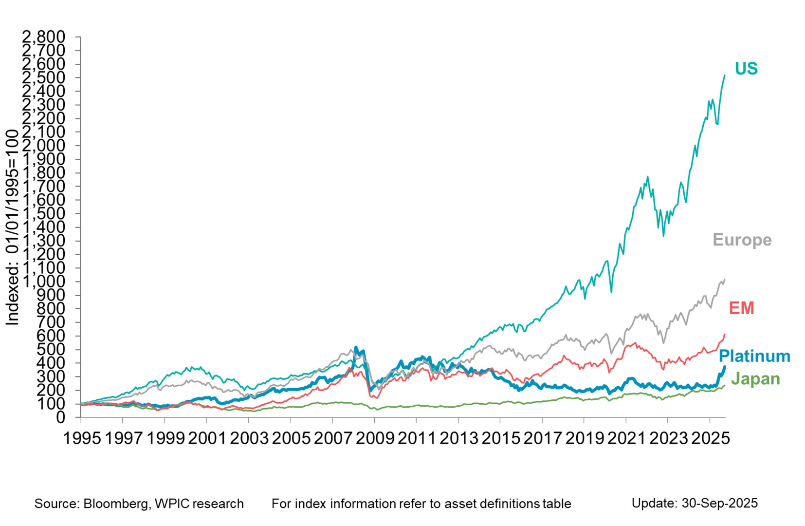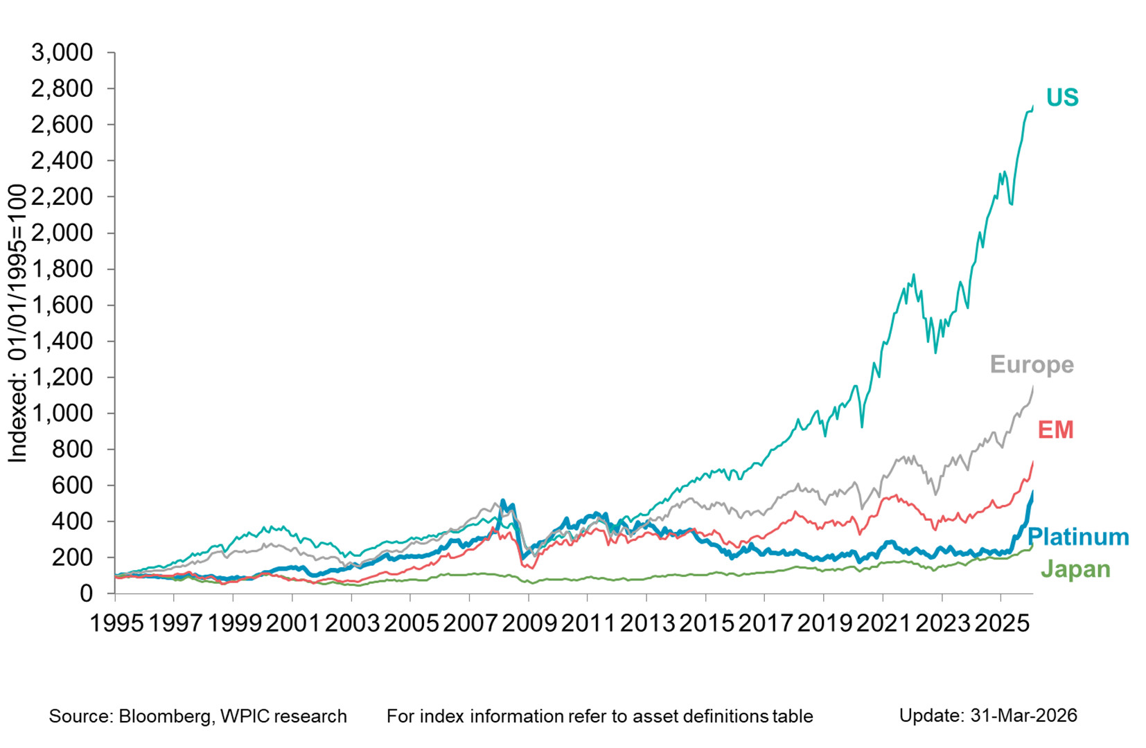 Platinum vs. equity indices since 1995