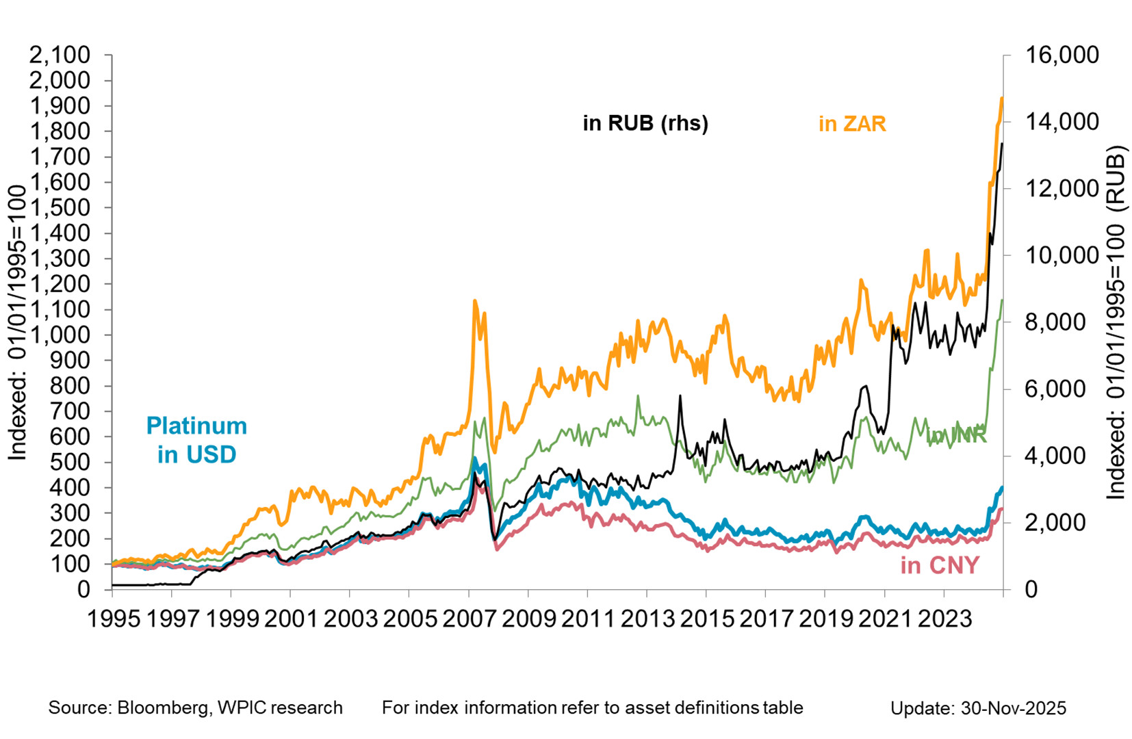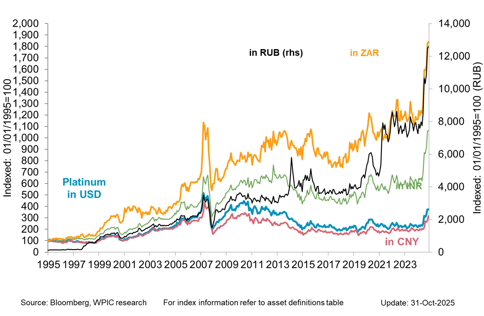 Platinum has risen faster in countries with depreciating currencies such as South Africa, Russia and India