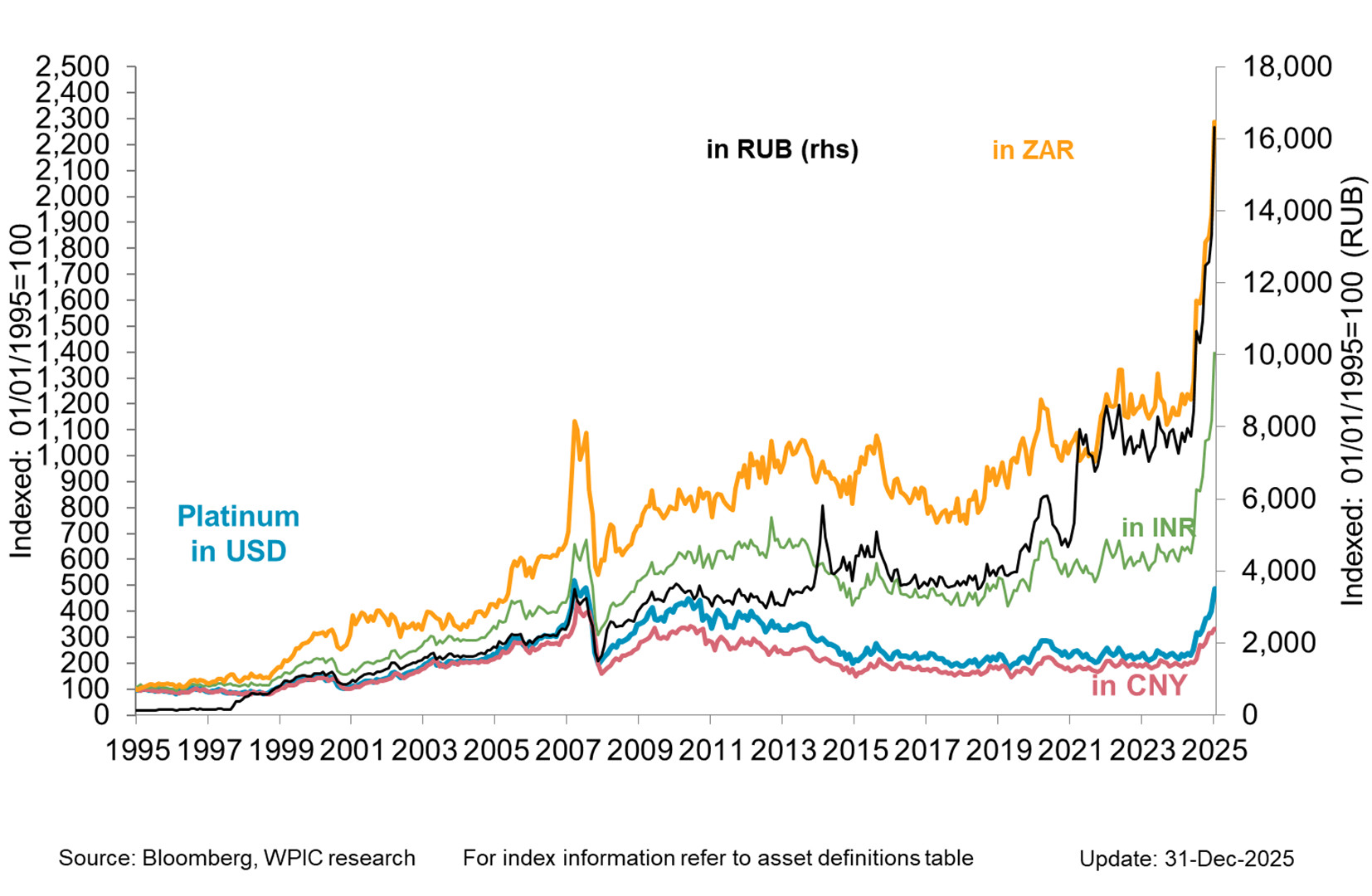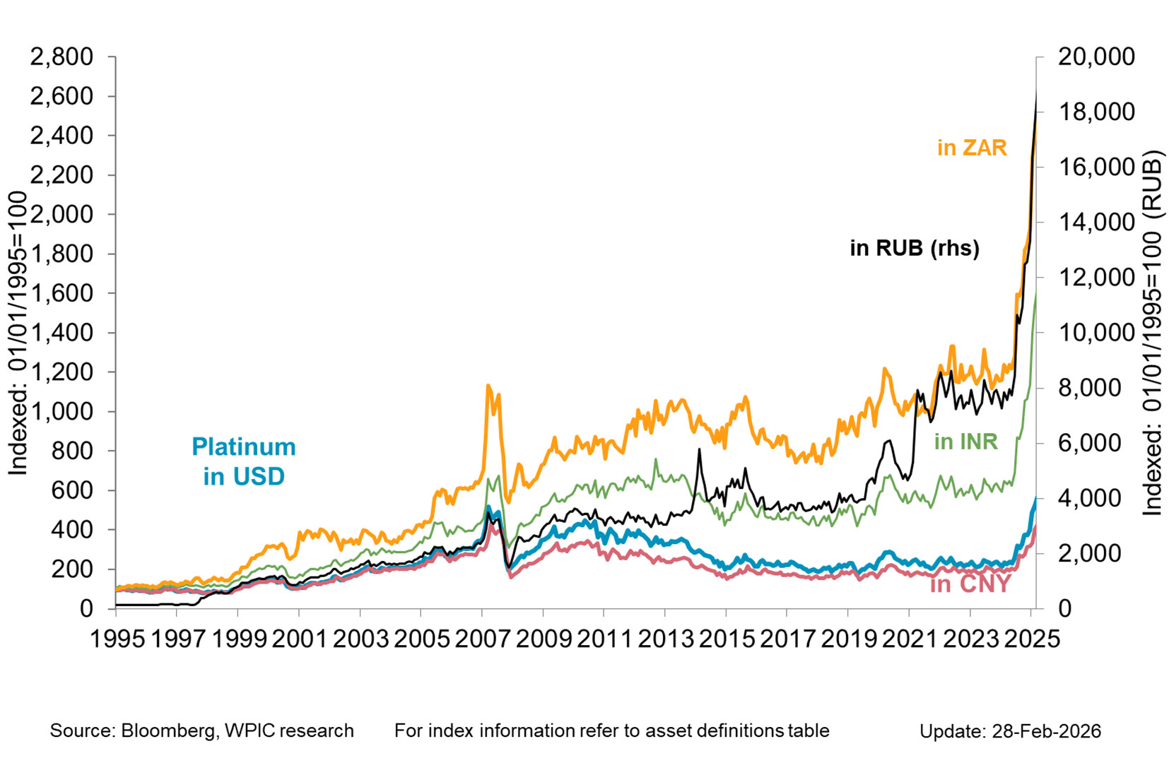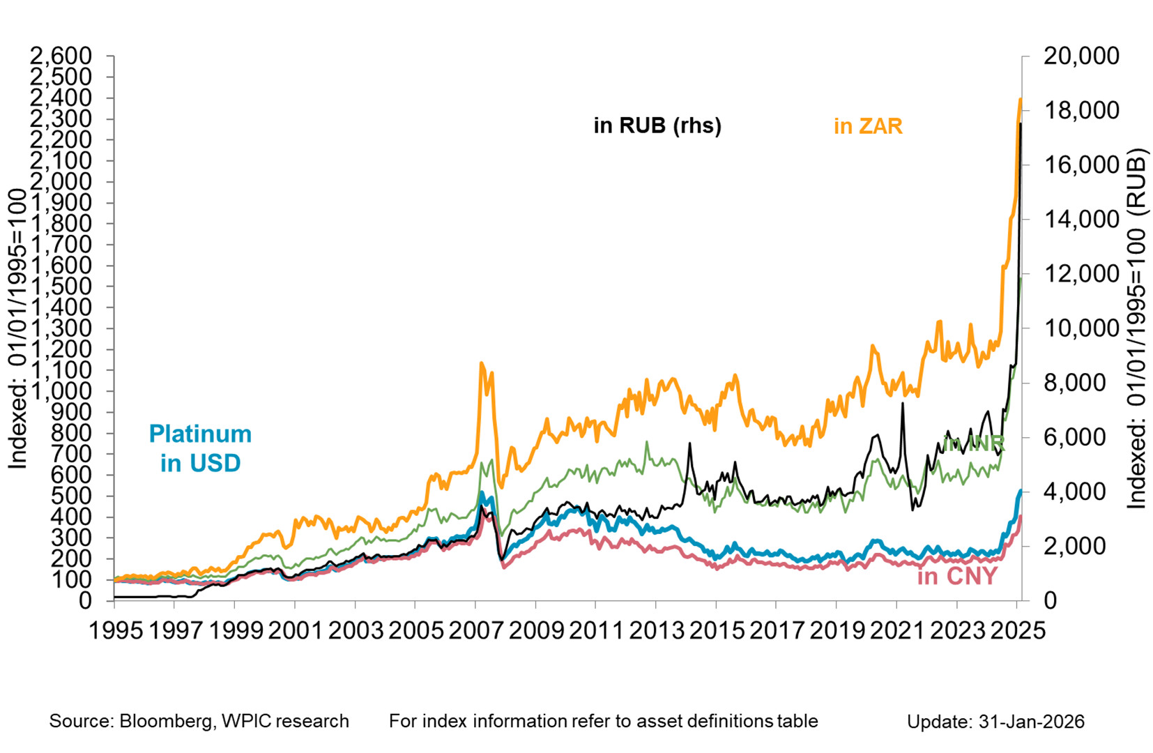 Platinum price in key emerging market currencies since 1995