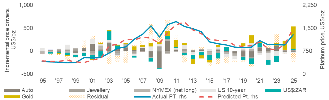 Figure 1. Our PPAM suggests gold prices and the US$:ZAR are the dominant incremental factors setting Pt prices
