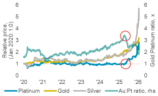 Our PPAM reflects the tailwind of precious metals sentiment, with gold underpinning much of platinum’s price setting in 2025 (Fig. 1). Notably, through January 2026, platinum’s early price momentum increasingly began to disconnect from the expected price derived from our PPAM (Fig. 5). The residual factor (i.e. unexplained price drivers) between spot and our PPAM exceeded US$500/oz by 26 January 2026 when platinum achieved an all-time high of US$2,923/oz. With the late January 2026 platinum price correction, the residual factor in our PPAM has declined to -US$11/oz suggesting prices are now aligned with traditional drivers.