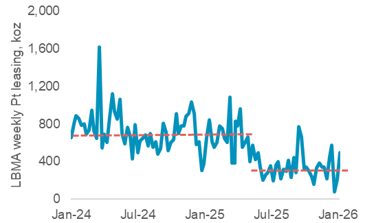In our view, platinum’s mild price recovery in February 2026 likely reflects some consolidation with investors returning their focus to tangible market dynamics such as platinum’s elevated lease rates (Fig. 6) and compelling supply demand outlook (Fig. 7).