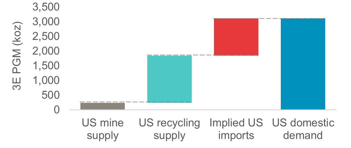 Figure 1. With limited domestic mine supply, the US is highly dependent on PGM imports (3E)
