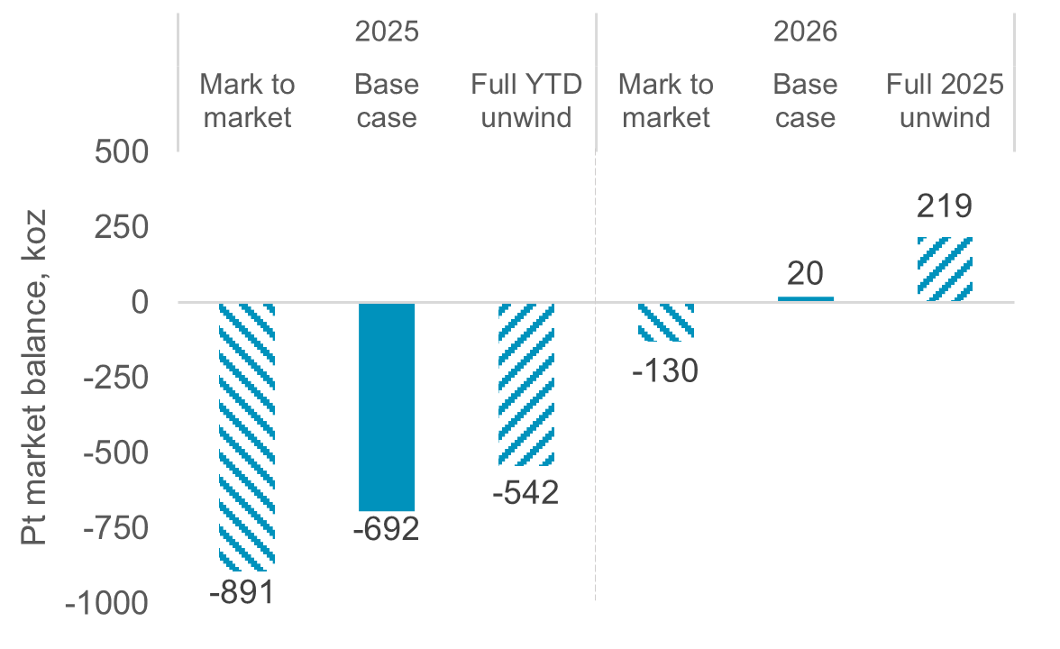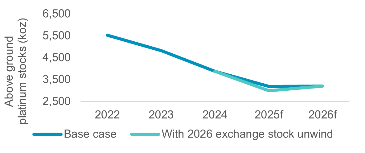 Figure 6: We have not included palladium exchange stock movements in our 2025 deficit of 260 koz, doing so would increase the deficit to 394 koz. Unwinding exchange stocks in 2026 moves the market into a 120 koz surplus.