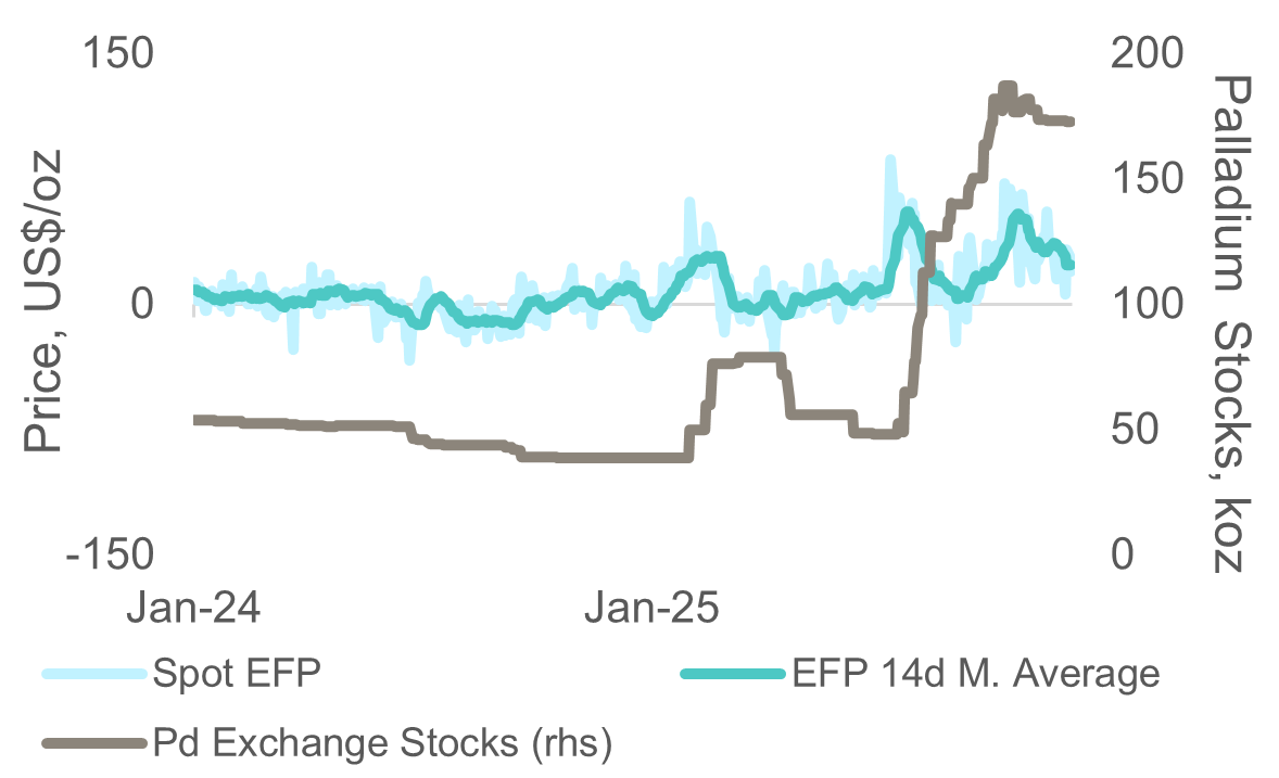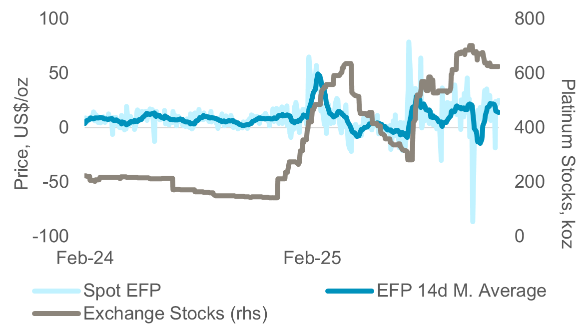 Figure 3: Tariff fears prompted a positive EFP, at its peak implying a ~5% risk adjusted tariff rate, driving platinum into CME warehouses, easing tariff risks and a negative EFP may release metal back to the market