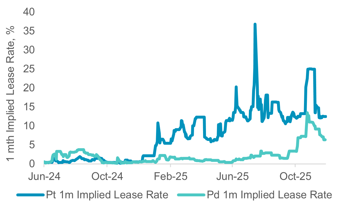 The US is net short PGMs (fig. 1). Accordingly, with the US’s Section 232 (S232) investigation into critical minerals having likely concluded (albeit not yet made public), our base case is that PGMs are unaffected since disrupting imports may harm high value-add domestic sectors such as vehicle production. This aligns with the US reducing tariffs on China to maintain rare earth imports. However, the threshold for an adverse S232 outcome is relatively low, meaning that PGM tariffs or import quotas cannot be totally ruled out. Sustained fears of potential tariffs or quotas may impact the availability of CME warehouse stocks to help ease tight markets and soften high lease rates.