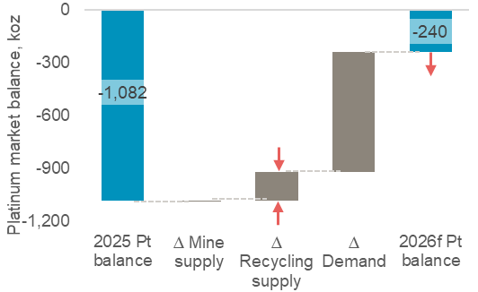 Figure 7: Should recycling supply growth underperform expectations, it would support a mildly deeper platinum market deficit in 2026f, whereas…