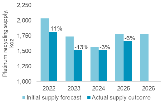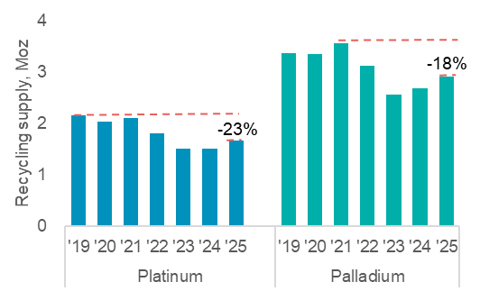 - Platinum supply remains challenged, materially for mining supply, less so for recycling supply