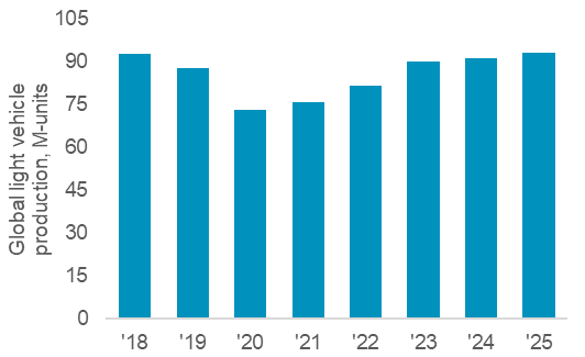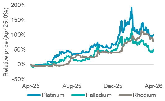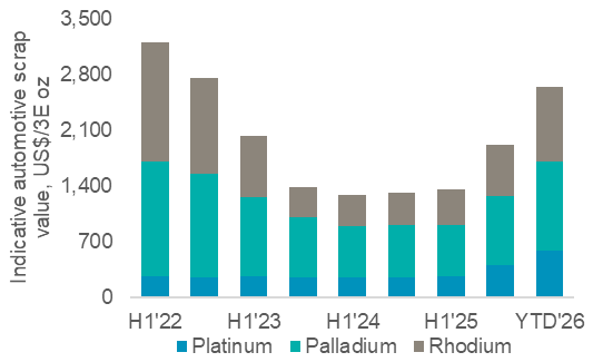 Firstly, the industry is reportedly facing working capital constraints due to higher PGM prices and interest rates with banks being cautious in extending credit facilities, limiting potential output. Secondly, the contagion of the Iran War across the strait of Hormuz is impacting trade across the Middle East. The UAE has developed into reasonably sized aggregation hub for automotive PGM recycling, and a protracted conflict may restrict metal flows. Another aspect which could weigh on recycling supply, would be a conflict-led slowdown in the new vehicle market. Were this to occur, we would concurrently expect an automotive demand impact.
