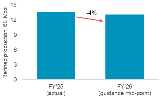 Figure 4: Key PGM miners are, in aggregate, guiding for FY’26f refined production to decline by 4% versus FY’25