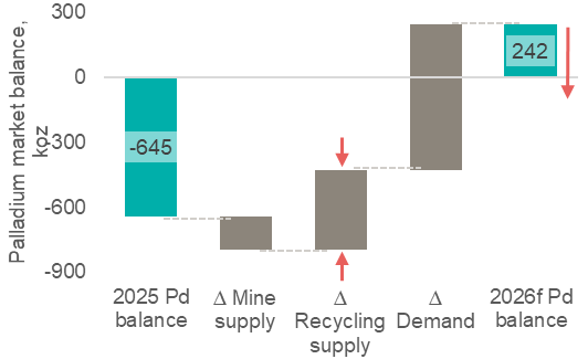Figure 8: …Should palladium recycling supply growth underperform expectations, it may support markets remaining in deficit versus transitioning to surplus in 2026