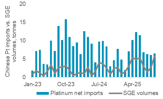 Figure 7: One-way flow means SGE volumes only make up a proportion of China’s platinum imports. A recent trend higher may be a function of growing investment and jewellery demand.