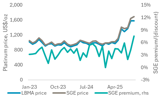 Figure 8: SGE platinum prices track LBMA, but increased liquidity in China could change price discovery dynamics