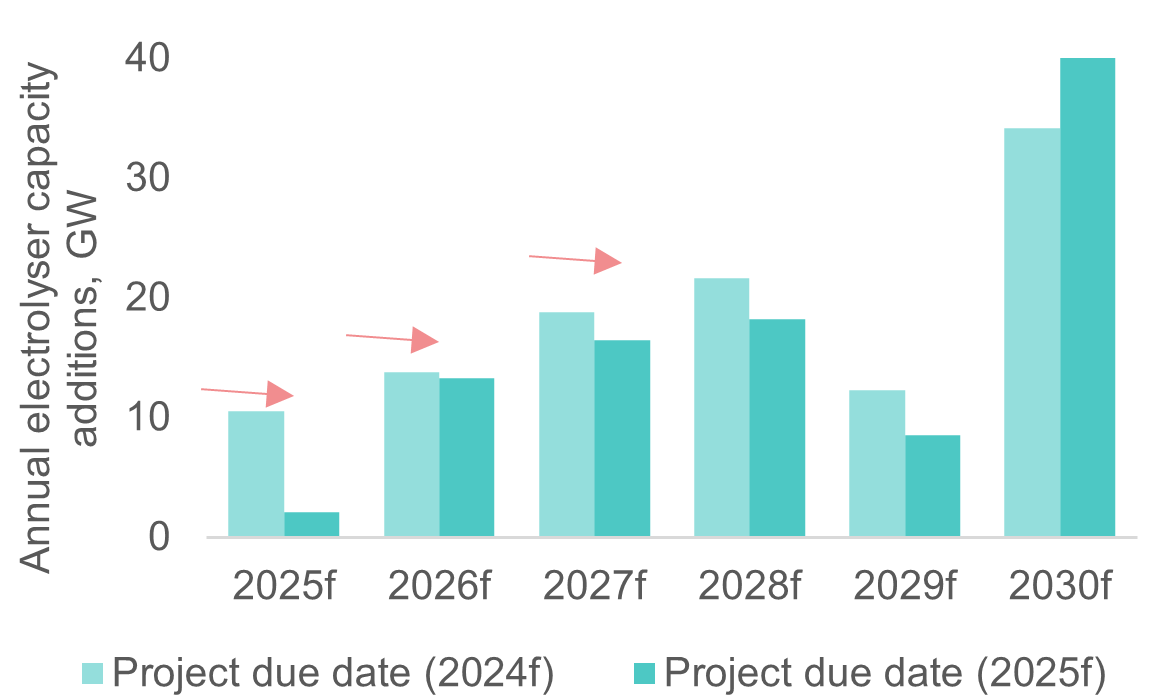 After applying these weightings, WPIC expects total cumulative electrolysis capacity to reach 225 GW by 2040f, a 6% increase versus the 2024 database, but well below the ~1,100 GW of project capacity listed by the IEA (Fig. 4). The upward revisions to total electrolyser capacity masks trends across pre- and post-2030f time frames. Due to ongoing industry challenges, electrolysis capacity forecasts have been reduced by 24% from 2025f to 2029f (Fig. 1) as projects are deferred or cancelled.