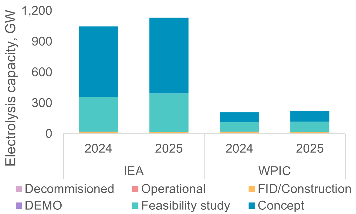 The IEA hydrogen production projects database details operational and proposed electrolyser plans globally. The database is updated annually, with the following key highlights from the 2025 edition (relative 2024).