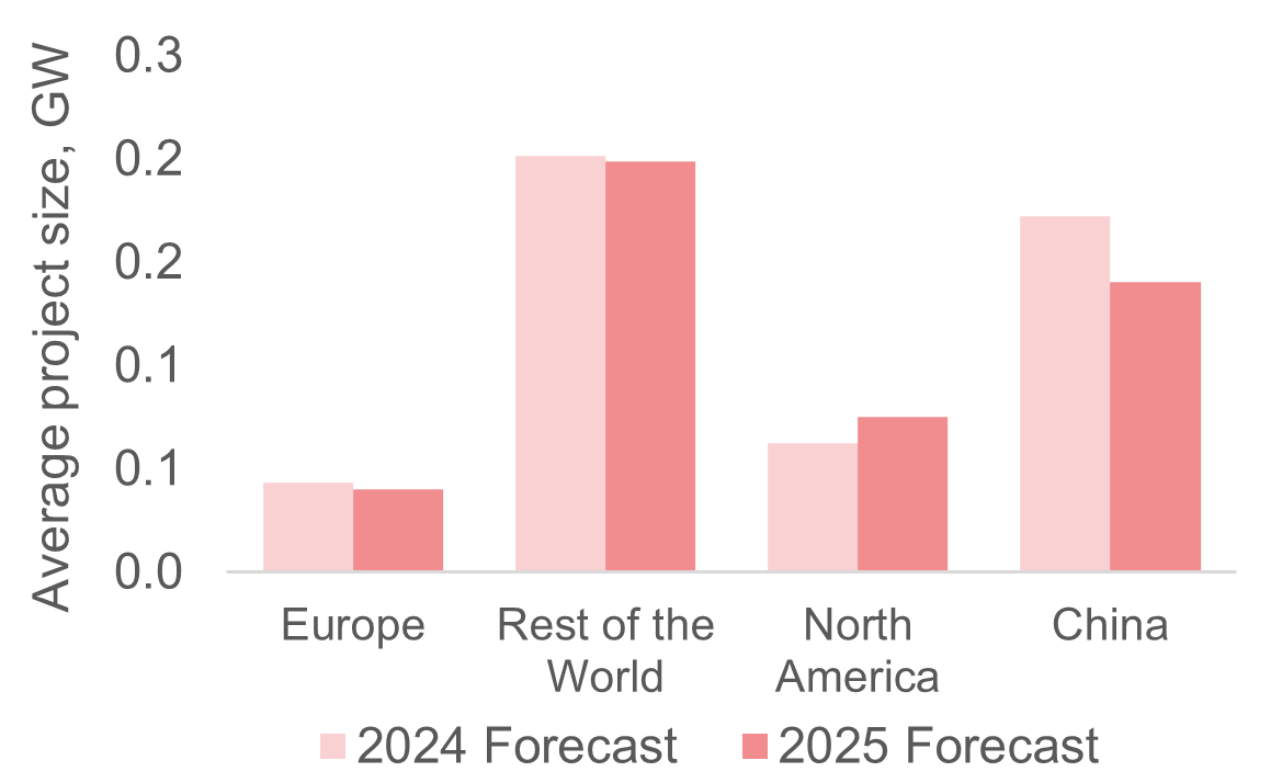 Figure 5: Average probability adjusted individual project sizes have decreased by 5%, with RoW hosting the largest projects and Europe the smallest