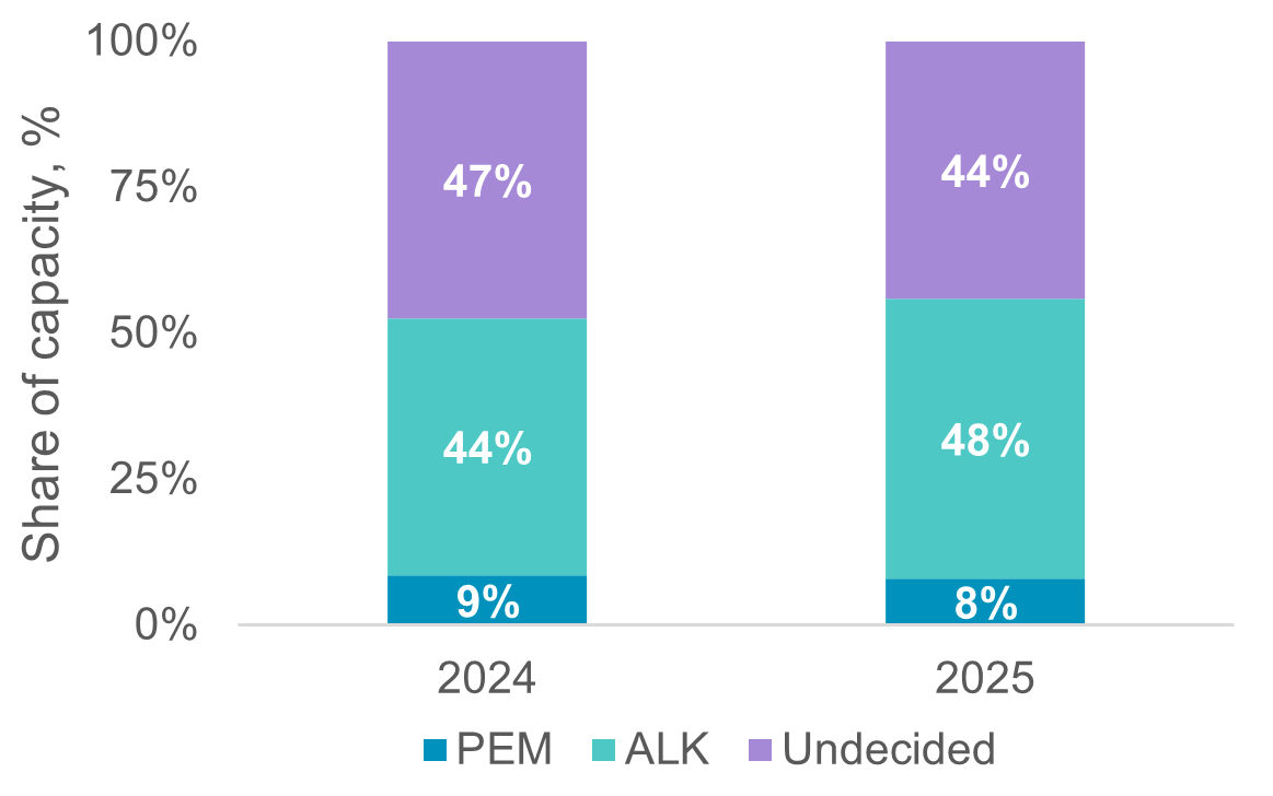 Figure 6: The share of alkaline electrolysis to 2030 has increased by 4% reducing PEM market share