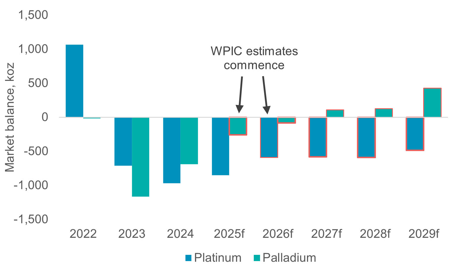 Figure 1. Platinum and palladium market balances 2022 to 2029f